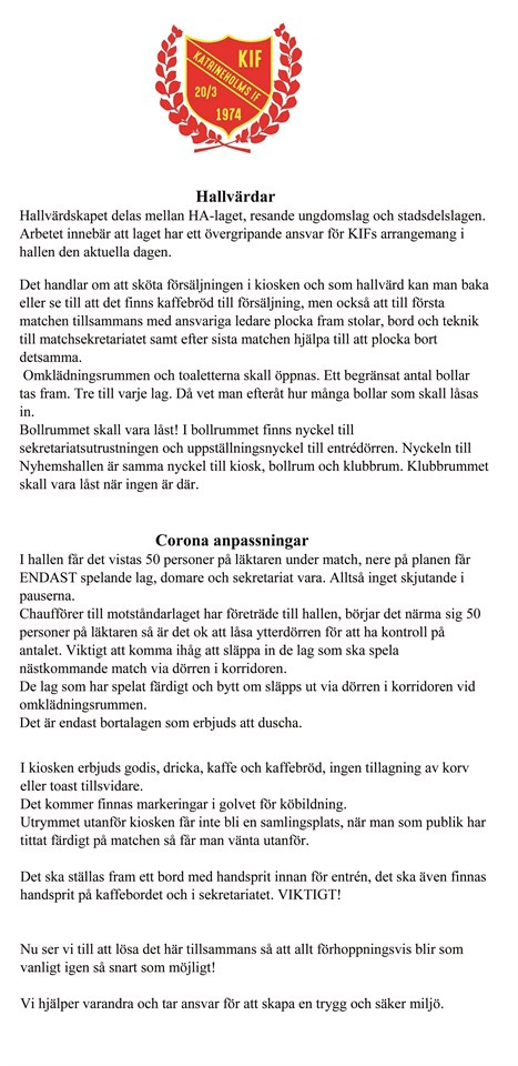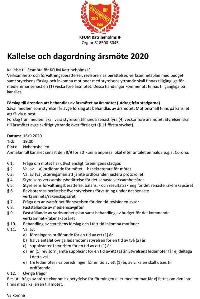 KFUM Katrineholms IF inbjuder alla medlemmar till Årsmöte. Onsdagen den 16 september klockan 19.00 i Nyhemshallen. Dagordning finns i våra stadgar som kan läsas på vår hemsida. Obs. Anmälan till kansliet senast den 8/9 för att kunna anpassa lokal efter antalet anmälda p.g.a. Corona. Kallelse och dagordning årsmöte 2020.pdf
