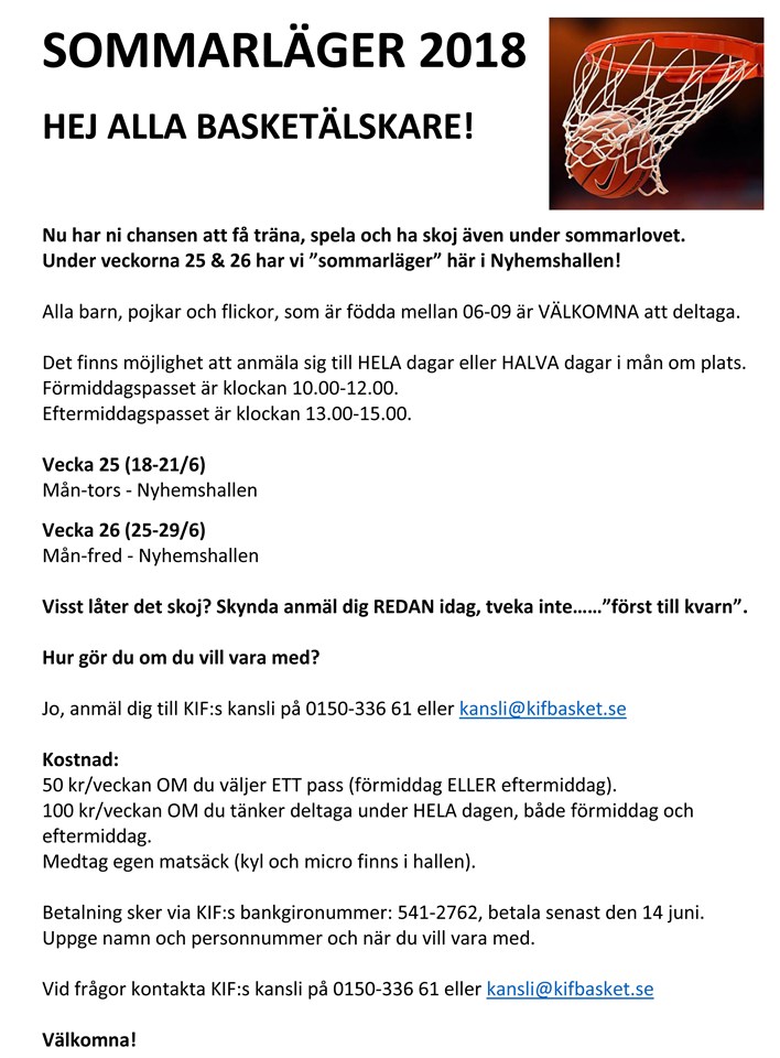 Hej Ledare! Även detta år har KIF Basket fått möjlighet att, genom stipendier givna av Katrineholm Rotary, skicka ungdomar på en frivecka till Stadium Sports Camp. Vi har i år blivit erbjudna så många som 10 friplatser för ungdomar 11-14 år, vilket vi såklart är oerhört tacksamma för! Nu behöver vi Er hjälp att hitta fram de 10 ungdomar i KIF Basket som förtjänar att få dessa stipendier! Vi önskar att ni nominerar spelare vilka ni finner är ambitiösa, goda kamrater och vilka under säsongen påvisat god lagmoral. Viktigt att ha i åtanke är att de som nomineras ska vara ungdomar vars familjer annars inte haft råd att låta sina barn medverka på Sports Camp. Också att ungdomen ska vara mogen att resa själv med andra ungdomar och bo borta. Vi önskar Era nomineringar senast t.o.m. vecka 15 via mail till styrelse@kifbasket.se . Nomineringen ska bestå av ett namn, samt en mening eller två på hur denna ungdom stämmer överens med kriterierna för stipendiet. Rotary eftersträvar en fördelning mellan könen på dessa stipendiater, samt en fördelning på svensk/nysvensk. Detta ansvarar styrelsen i KIF Basket för utifrån de nomineringar Ni ledare ger oss. Om en ungdom från ditt lag blir utvald att tilldelas detta stipendium, ansvarar du som ledare för att informera föräldrar så att de passar i familjen sommarplaner. Har ni några frågor är ni varmt välkomna att kontakta styrelsen via mail! Tacksam för all Er hjälp! Emelie Trolin, ordförande KIF Basket styrelse@kifbasket.se Praktisk information om Stadiumveckan för Rotarys stipendiater: • Börjar söndagen den 8 juli med samling vid Safiren i god tid för avprickning, lastning av bagage och bussavgång prick 11.00. • Lakan och kudde ska medhavas! • Lägret slutar lördagen den 14 juli där buss väntar efter slutshowen i stora Stadiumhallen som beräknas till ca 14. Hemkomst till Safiren vid 15.30 tiden.
