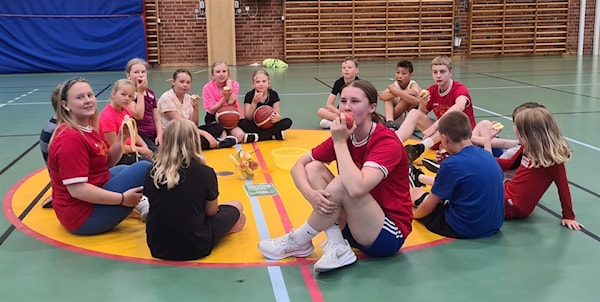 Glada basketbarn med de duktiga ledarna, tar en fruktpaus.