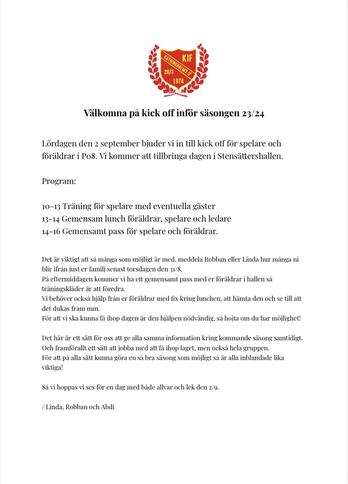 Så här ser planen för lördag ut: 9.45-13 träning för spelare 13-14 lunch för alla 14-16 möte och aktivitet för alla. På eftermiddagen är alla välkomna! Vi ses 😀 Linda, Robban, Abdi och Mommo.